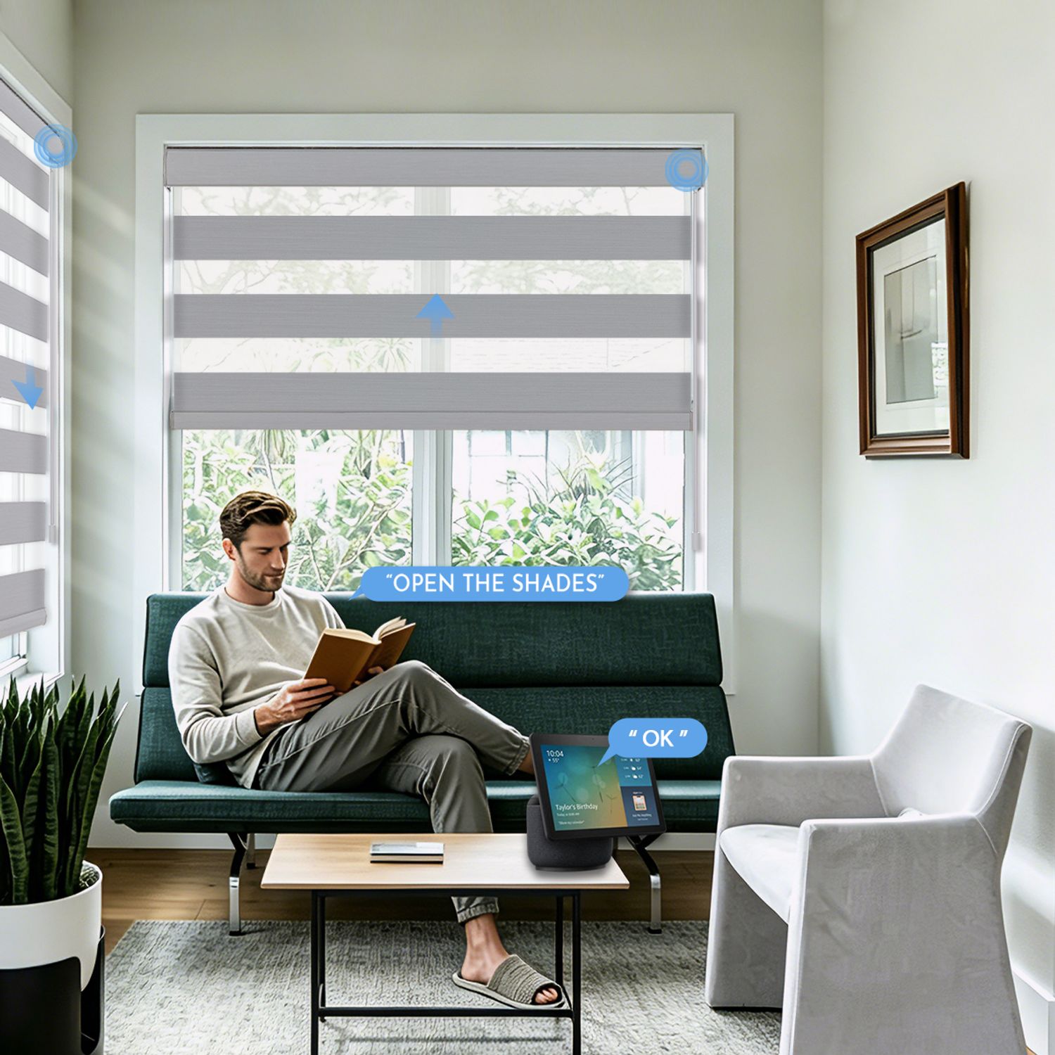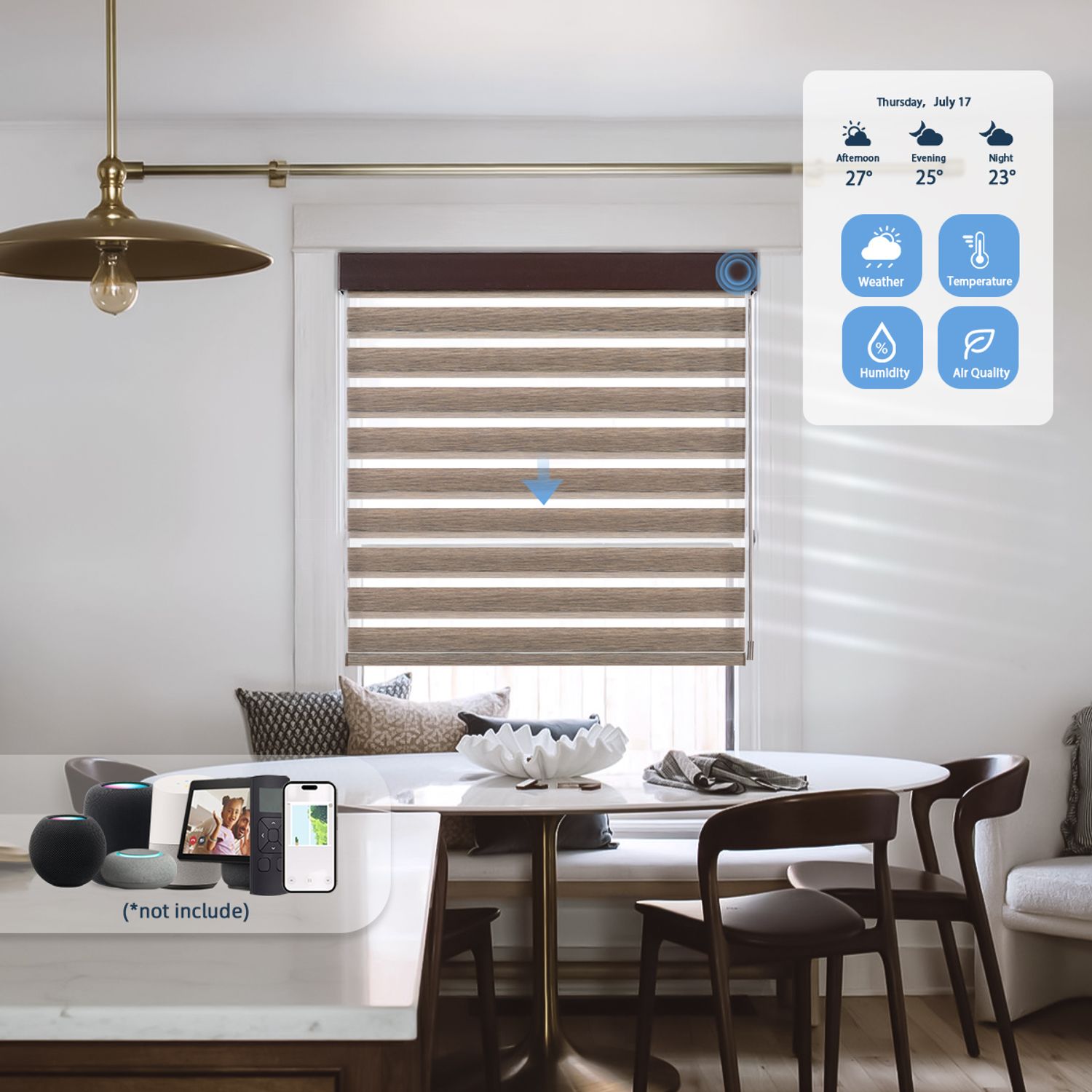 Eve Motionblinds Motorized Zebra Shades can be turned smart in under a minute and controlled in virtually every way you can imagine — using smartphones, smart speakers, remote controls, or even a gentle pull that sets the blinds in motion automatically. The installation requires no cables, and charging is done via USB-C. They work without a bridge or any cloud connection, ensuring complete privacy. They're a great fit for smart homes using Apple HomeKit technology.